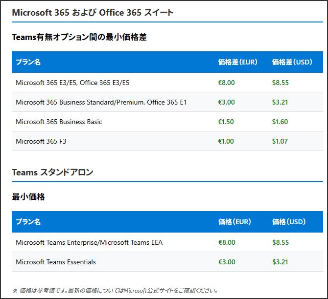 ① の項目を考えると Teams バラ売りの値上げとも取れるし、Teams が不要なユーザーにとっては値下がりと考えられる微妙すぎる内容。