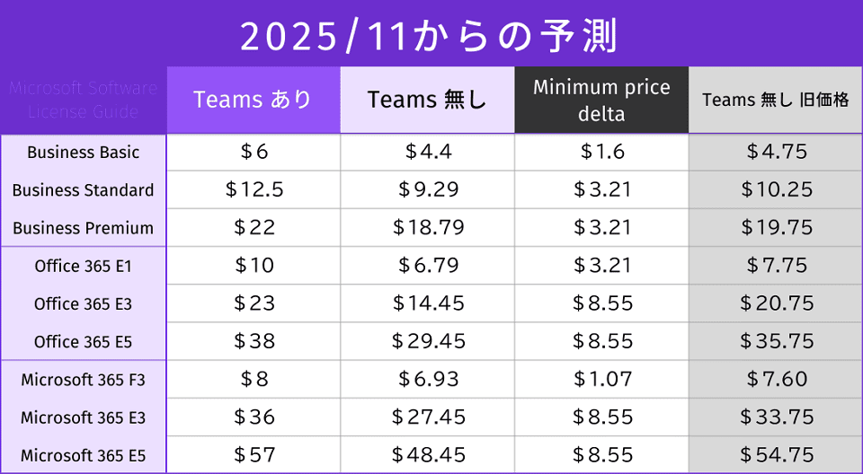 あとは Teams ありプランの価格(推測価格を含む)から、2025 年 11 月に採用される新しい価格デルタをマイナスすれば新提供価格を算出できます。ここまで長くなりましたが、以下画像が当サイト予測価格と旧価格の一覧表です。(リリース時に異なってもクレーム入れないで下さい 🤷♂️)